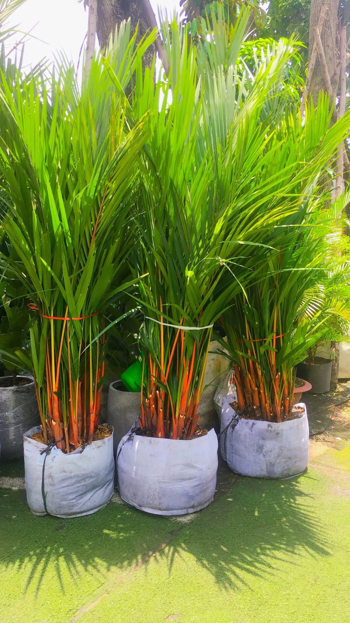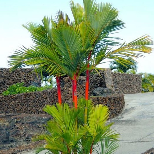 * Điểm nổi bậc của loại cau này là thân với cuốn lá có màu đỏ tươi, bóng loáng.