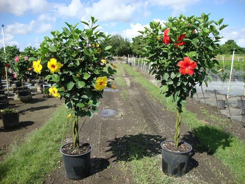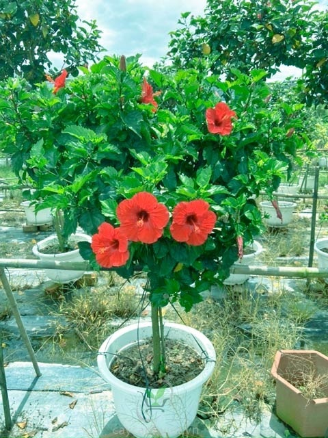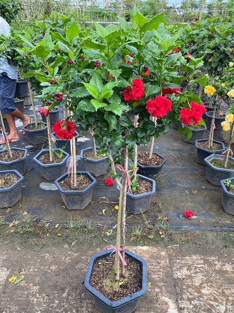 Cây Dâm Bụt dáng tree khá thịnh hành trên thị trường hiện nay. Giống này có dáng cây thẳng đứng tròn trịa, mang những bông hoa màu đỏ tươi rực rỡ: có thể trồng nền, làm hàng rào, rất tuyệt vời khi trồng trong chậu đứng.