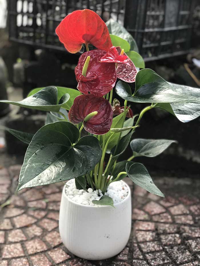 * Hồng Môn mang dáng dấp nhỏ xinh, hoa đỏ sắc rực rỡ, lá xanh mướt mơn mởn, tạo không khí tươi mới và điểm nhấn nổi bật cho không gian nhà bạn. Bạn có thể trồng chậu đất hay trồng thủy sinh để lộ phần rễ sinh động đều có thể được.