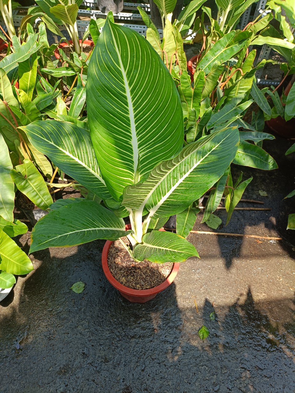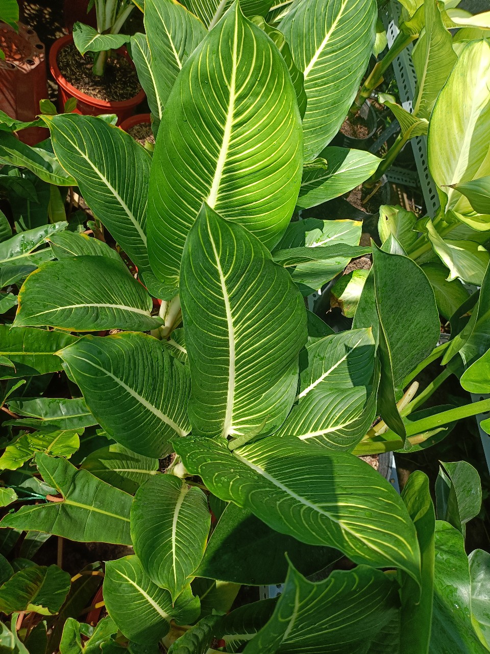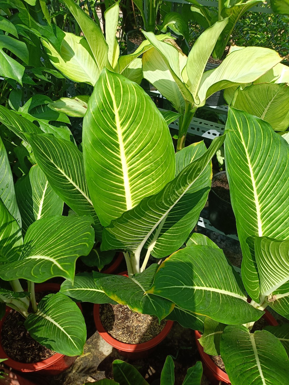 Cây Oai Hùng có thân trắng tinh với dáng thẳng đứng nhìn vô cùng đẹp. Những chiếc lá to xanh có các đường gân sọc trắng nổi rõ, làm tô điểm thêm điểm tinh xảo. Cây thường được trồng chậu trang trí, hoặc trồng tiểu cảnh, sân vườn, ban công sân thượng rất đẹp mắt.