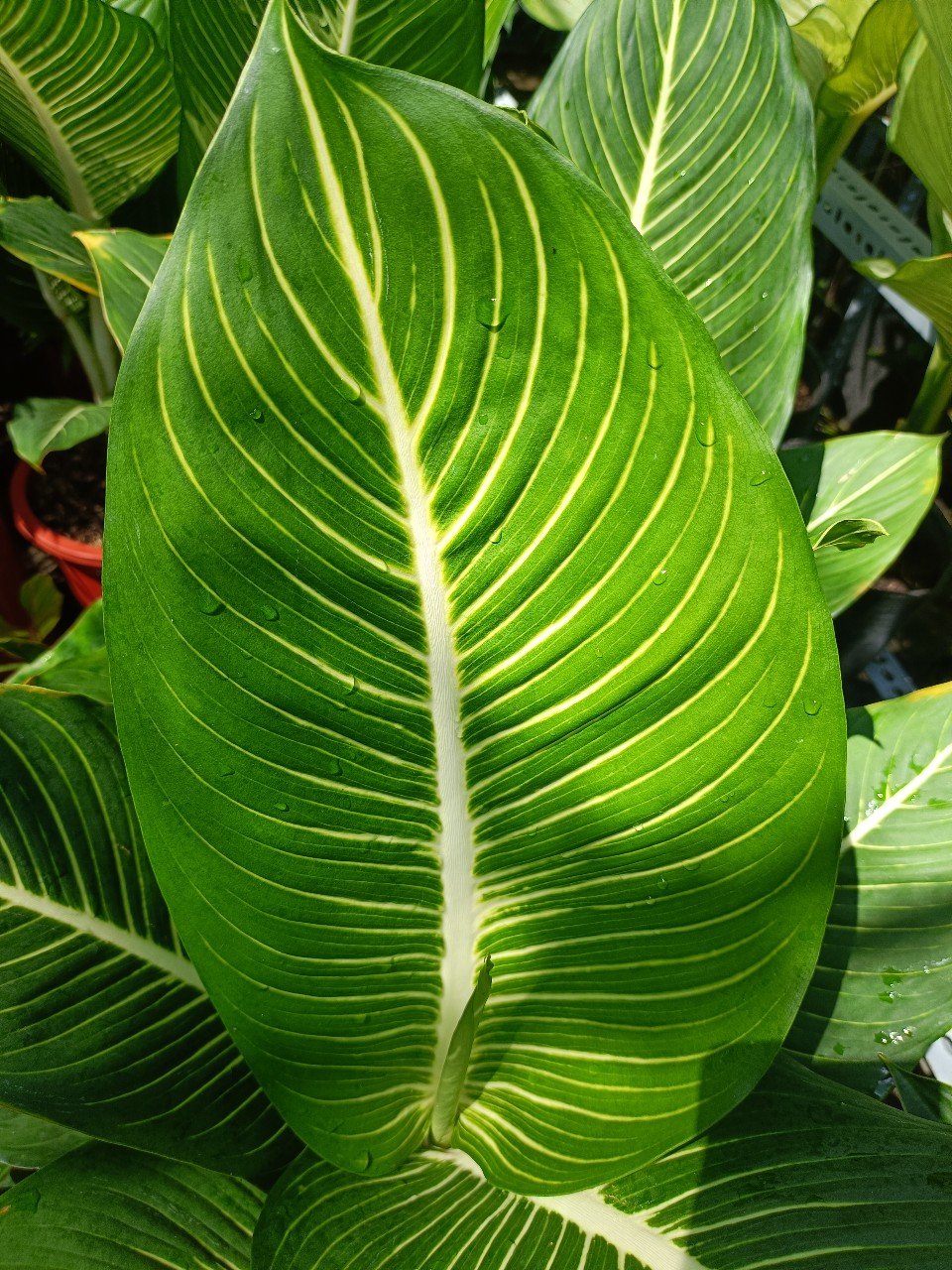 * Lá hình bầu tròn dài có phần nhọn về phía đỉnh,lá to, thường xòe ra hai bên, cuốn mập ôm lấy thân.Lá thường mọc tập trung ở phần ngọn, càng xuống gốc càng thưa dần. Lá màu xanh có đường gân màu trắng ngà nổi rõ.