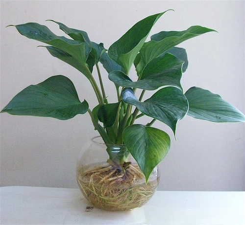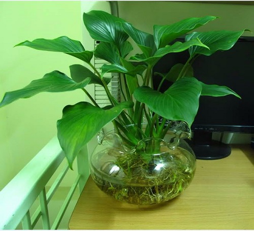 – Rất dễ trồng thủy canh đối với loại cây này; bạn chú ý chọn cây khỏe mạnh tỉa sạch phần lá úa rễ vàng, sau đó bỏ vào bình thủy tinh, dùng vài viên sỏi (trắng hoặc màu) vào cố định phần rễ để cây có tư thế đẹp. Tiếp đó là đổ nước sạch có pha ít dung dịch dinh dưỡng dành cho cây thủy sinh và đem chậu vào nơi có ánh sáng và mát mẻ, tránh ánh nắng trực tiếp.