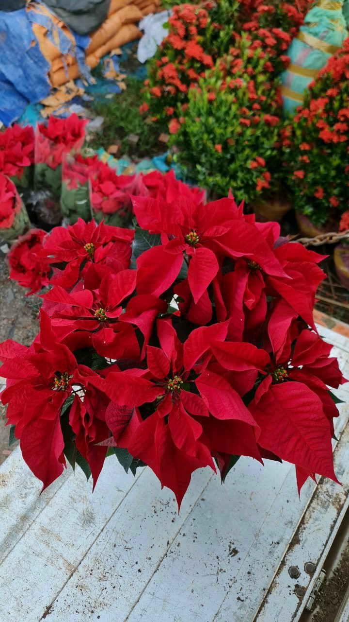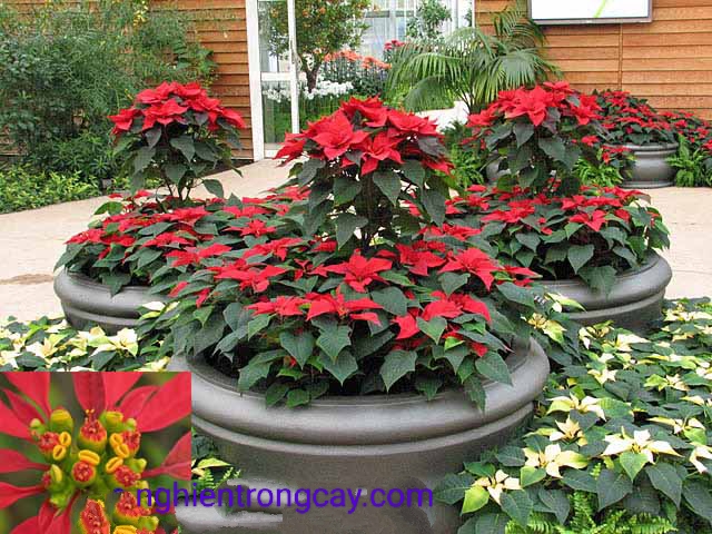 * Điểm đặc biệt của cây là những chiếc lá bắc tập trung phía trên có màu đỏ rực rỡ, thoạt nhìn chúng ta cứ tưởng đây là hoa của chúng.