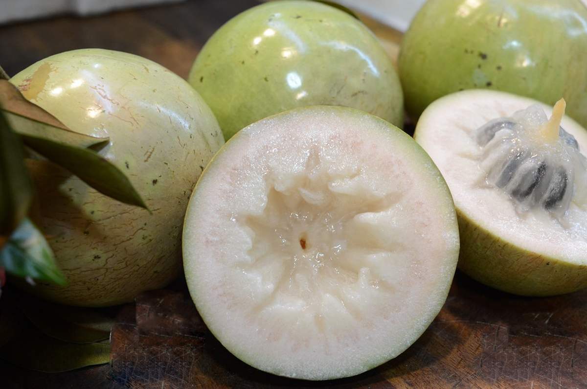 * Quả tròn hoặc hình cầu. Vỏ mỏng, màu trắng, dày ruột, hột nhỏ. Màu sắc quả vàng nhạt, hơi ửng hồng, phần vỏ còn lại có màu xanh nhạt, bóng, dài, mềm, nhiều nước, vị ngọt béo, mùi thơm thoảng. Lúc chín, quả phơn phớt vàng hồng, thoảng thơm, mát dịu, ngọt thanh…
